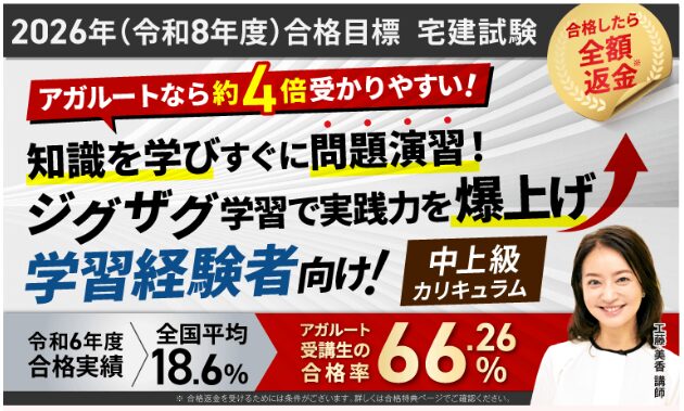 令和6年度の宅建試験では、全国平均合格率18.6%に対して、アガルート受講生の合格率は66.26%(約3.5倍)。