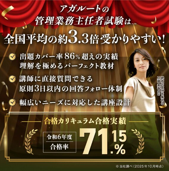 - →合格率は高いものの、難易度は“ほぼ同等”。理由は、管業は 法令問題の比重が大きく読解力が必須 だからです。ここがアガルートが選ばれる理由の一つ。